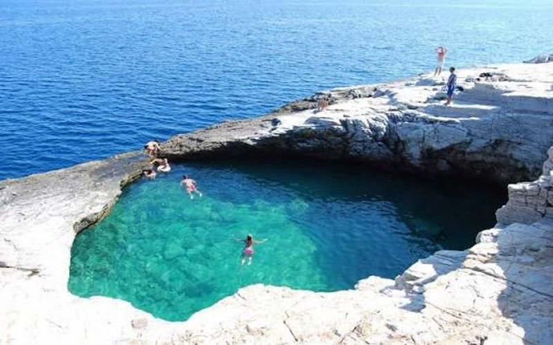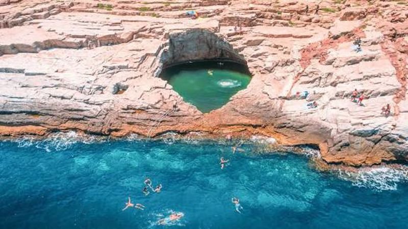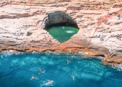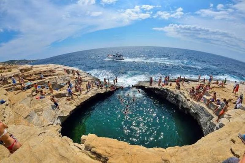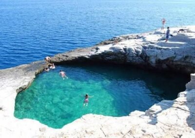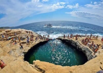 Die Giola auf Thasos ist eine natürliche Felsenlagune, die auch als „Auge des Meeres“ bekannt ist. Ein kurzer, etwas steiler Wanderweg führt von der Küstenstraße hinunter zu dieser einzigartigen Naturformation. Dort können Besucher im türkisfarbenen Wasser baden und die spektakuläre Aussicht genießen – ein unvergessliches Erlebnis auf der Insel Thasos.